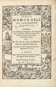 CORAS (Jean de). Arrest memorable du parlement de Tholose contenant une histoire prodigieuse d'un suppose mary, advenüe de nostre temps : enrichie de cent & onze belles & doctes annotations. Paris, Galliot du Pré, 1572. In-8, vélin souple de...