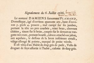 D'ASSASSINAT DU ROI LOUIS XV. "Signalement du 6 juillet 1756. Le nommé Damiens, surnommé Flamand, domestique, âgé d'environ quarante ans, haut d'environ 5. pieds 4. pouces, mal campé sur ses jambes, portant la tête un peu courbée, teint brun, cheveux châtins, tirant sur le brun, coupés sur le devant en vergette très-raze, portant bourse, rubans attachés au jabot, nez aquilain, le dessous de la levre inférieure creuse, visage allongé & pointu, marqué de petite vérole. Il est vêtu d'un habit de drap gris de perle, veste de droguet de soye assortie à l'habit, culotte de drap gris.” Note manuscrite de l'époque ajoutant à la suite de la date : "lorsqu'il fit un vol au Sr. Michel”. En effet, entré au service d'un certain Jean Michel, à Paris, Damiens lui avait dérobé ce 6 juillet 1756 240 louis d'or. Le signalement diffusé le jour même de son forfait ne put empêcher sa fuite à Calais. Damiens devait attenter à la vie du roi Louis XV quelques mois plus tard, le 5 janvier 1757.