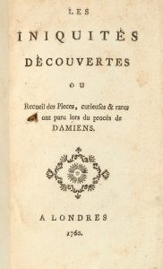 titre et de tomaison fauves, tranches rouges (reliure de l'époque). du ,12-au format in ,Edition originalerecueil des pièces du procès de Damiens. Joint, en reliure uniforme : - [GROSLEY (Pierre-Jean)]. Les Iniquités découvertes ou Recueil des pièces, curieuses & rares qui ont paru lors du procès de Damiens. Londres, 1760. CE R D IT IO N ORIGINALE DE ÉECUEIL DE 5 PIECES SUR LE PROCES DAMIENS. Trois des pièces reviennent à Pierre-Jean Grosley : "contenant des faits calomnieux ; faux dans leur substance, dans leur énoncé & dans leurs circonstances ; tendans à émouvoir les esprits ; contraires au respect du à la Magistrature ; & composez dans le dessein criminel d'altérer la juste confiance qui lui est duë”, celles-ci furent condamnées au feu. "Il est a remarquer que la Grande-Chambre a eu plus à creur de se venger en condamnant les trois ecrits au feu, que de se purger des accusations graves intantées contre elle par ces ecrits”, lit-on en fin d'ouvrage. Reliure modeste. Trou sur le titre des Iniquités découvertes, avec perte d'un mot.