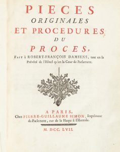 [DAMIENS]. Pièces originales et procédures du procès fait à Robert-Franfois Damiens, tant en la prévöté de l'Hötel qu'en la Cour de parlement. Paris, Pierre-Guillaume Simon, 1757. In-4 sur deux colonnes, veau marbré, dos à nerfs orné,...