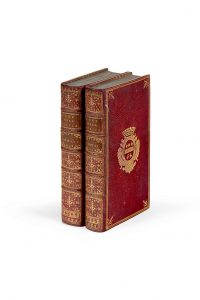 mise en deux parties. Paris, Prault père, 1767. 2 volumes in-12, maroquin rouge, dos à nerfs ornés, pièces de titre et de tomaison de maroquin olive, triple filet doré encadrant les plats avec fleurons dorés dans les angles, armes dorées au centre, coupes et bordures intérieures décorées, ranches dorées (reliure de l'époque). Quatrième édition, en partie originale. "On a joint à la fin de cette quatrième édition plusieurs règlemens nouveaux” (p. VIII). Vade mecum à l'usage des policiers et des magistrats, ce Code de la Police est un abrégé commenté et actualisé du traité de Delamare en quatre volumes in-folio qui "n'est pas à la portée de tous ceux qui concourent à l'administration de la Police dans les provinces” explique Duchesne en préface. Il était lieutenant de Police à Vitry-en-Champagne. TRES BEL EXEMPLAIRE DE DEDICACE AUX ARMES DE CHARLES ROBERT BOUTIN, CONSEILLER D'ÉTAT ET INTENDANT DES FINANCES. Arrêté pendant la Terreur, il périt sur l'échafaud en 1794. Ex-libris van der Elst. L'exemplaire a figuré sur le bulletin de la librairie Morgand (n° 40754).