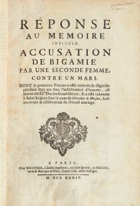 bigamie par une seconde femme, contre un mari, dont la première femme a esté enlevée & déguisée pendant sept ans sous l'habillement d'homme, est morte chez Duclos comédienne, & a esté inhumée à Saint Sulpice sous le nom de Chevalier de Morsan, huit ans avant la célébration du second mariage. Paris, Mesnier, 1734. 2 pièces en un volume in-folio, cartonnage à la Bradel moderne. Cartonnage usagé. Page de titre et dernier feuillet de la Réponse restaurées.