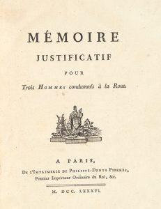 [DUPATY (Charles)]. Mémoire justificatif pour trois hommes condamnés à la Roue. Paris, de l’Imprimerie de Philippe-Denys Pierres, 1786. In-4, cartonnage moderne à la Bradel, pièce de titre de maroquin rouge. Édition originale. Ouvrage...