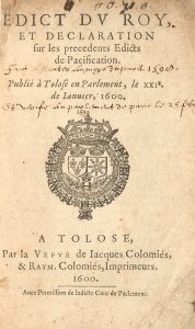 Edict du roy et declaration sur les precedents Edicts de Pacification. Publié à Tolose en parlement, le XXIe de janvier, 1600. Toulouse, par la veuve de Jacques Colomiès & Raymond Colomiès, 1600. Relié avec : Declaration du Roy, sur les Edicts...