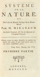 [HOLBACH (Paul Thiry, baron d')]. Systême de la nature ou des loix du monde physique & du monde moral. Par M. Mirabaud, secrétaire perpétuel, & l'un des quarante de l'Académie franfoise. Londres, [Amsterdam] 1770. 2 volumes in-8, veau marbré,...