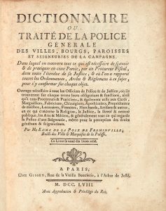 LA POIX DE FRÉMINVILLE (Edme de). Dictionnaire ou Traité de la police .neuries de la campagneparoisses et seig ,bourgs .génerale des villes Paris, Gissey, 1758. In-4, veau marbré, dos à nerfs orné, pièce de titre de maroquin rouge, tranches...