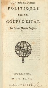 à une centaine d'exemplaires, avait paru en 1639. "Dans ses Considérations sur les coups d'État, sans illusion sur les sources du pouvoir, qui, à ses yeux, est toujours fondé sur la force, il prone la séparation de la politique d'avec la morale et la religion, et le pouvoir sans partage du monarque. (...) Son attitude est exemplaire des options des libertins : méfiants à l'égard du peuple, qu'ils jugent superstitieux et ignorant, ils voient dans l'absolutisme une nécessité historique” (A. Viala). Ainsi débarrassé de considérations d'ordre moral, il va jusqu'à faire l'apologie de la Saint-Barthélemy, une apologie, dit Nodier, "d'une candeur de férocité qui étonne et qui révolte”. Bon exemplaire portant quelques annotations. Ex-libris Fideikommissbiblioteket.
