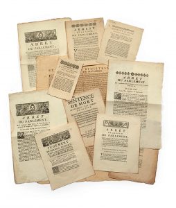 47 AFFAIRES CRIMINELLES DES XVIIe ET XVIIIe SIECLES. La plupart des documents furent émis par la cour du Parlement de Paris. Les arrêts précisent la nature de la peine ainsi que, le cas échéant, l'amende honorable précédant l'exécution. Ainsi, une femme accusée d'assassinat sera "livrée entre les mains de l'Exécuteur de la haute Justice, pour la mener dans tous les carrefours & lieux accoutumés [de Valenciennes] & devant la principale porte de la chapelle de Saint Pierre, faire amende honorable, pieds nus, la corde au cou, tenante [sic] une torche de cire ardente du poids de deux livres, & à genoux”. Dans certains cas, la question ordinaire et extraordinaire est préalablement appliquée, notamment pour obtenir l'identité d'éventuels complices. Les condamnations à la roue ou à l'échafaud sanctionnent généralement des délits d'assassinat ; la pendaison et la galère, les délits plus mineurs comme les atteintes à la dignité royale, la fraude, le chantage, les vols avec effraction, les abus sexuels, etc. LES PEINES LES PLUS SEVERES FURENT PARFOIS PRONONCEES POUR DES DÉLITS mineurs ; CETTE COLLECTION JETTE UNE LUMIERE CRUE SUR LA REALITE JUDICIAIRE de l'Ancien regime, quand "surveiller et punir” consistait surtout a punir pour l'exemple. Galères et prison : 7 affaires Louis-Marlin, garfon marchand de vin est condamné au "fouet, à la marque & aux galéres, pour avoir abusé & infecté de maladie vénérienne une petite fille âgée de sept ans” (21 janvier 1760) ; Robert Pons, prêtre, aux galères à perpétuité pour avoir "abusé des prières et cérémonies de l'Eglise, & de la crédulité des gens du peuple” (4 juillet 1758) ; Franfois Roger dit La Breche aux "Galleres pendant cinq ans, & d'être marqué des trois lettres G, A, L, pour attroupemens & port d'armes” (13 décembre 1731) ; Louis-Jean-Xavier-Antoine Venuste Meynier, chevalier de la Salle, profanateur, vagabond et imposteur, au carcan et aux galères perpétuelles (27 avril 1780) ; Laurent Moncoq, "ayant faussement supposé qu'il avait un ordre du roi de prendre les enfants du nommé Gilles-Adam Bardou, est condamné à la marque et à 9 ans de galères, après avoir été attaché à un carcan pendant l'espace de deux heures, sur trois jours de marché consécutifs, en ayant devant et derrière lui un écriteau portant ces mots : "imposteur et perturbateur du repos public ”, et le troisième jour battu et fustigé de verges” (1750) ; Joseph et Jean-Baptiste Buthiaud, réputés comme voleurs (10 mars 1788) écopent respectivement de neuf et cinq ans de galères ; Pierrette Occard, tricoteuse de bas, est condamnée à 3 ans d'enfermement à Bellevaux pour avoir fait le métier de diseuse de bonne aventure (2 mars 1780). Pendaison : 16 affaires Sont condamnés à la pendaison Jacques Riguet, prêtre du diocèse de Cambray, "pour avoir tenu des propos séditieux & fanatiques contre le Roi, le Parlement & l'Etat” (29 décembre 1762) ; Jean Moriceau de la Motte, huissier aux requêtes de l'hötel, également accusée d'atteinte à l'autorité royale (6 septembre 1758) ; Jean Guillaume "pour avoir écrit & envoyé des lettres de menaces à son maitre, pour en tirer de l'argent” (11 avril 1726) ; André-Guillaume Deshayes, notaire au châtelet de Paris et échevin de la même ville, pour banqueroute frauduleuse (24 février 1764) ; Claude Lapierre pour avoir mis le feu au couvert d'un moulin (11 septembre 1781) ; Marie-Catherine Favin, est condamnée à avoir le poing coupé, à être pendue puis brülée et Antoine Pommard à être roué vif, pour avoir conjointement commis l'assassinat de Jacques Bourde, mari de ladite Favin (1733) ; Pierre-Nicolas Pernet, Gendarme de la Gendarmerie, comme tapageur et meurtrier (10 janvier 1763) ; Marie-Anne Piquard & Claude-Franfoise Humbert pour vol et assassinat (23 octobre 1782) ; Anne Mouvet, pour le même délit ; Elle aura au préalable le "poing du bras droit coupé au pié de la potence, sur un poteau qui y sera planté à cet effet” (20 septembre 1766) ; 7 condamnations concernent des vols avec effraction et fabrication de fausses clefs, pour certains ; Bücher : 5 affaires (4 arrêts) Sont condamnés à être brülés vifs et leurs cendres jetées au vent Jacques Vislette, tisserand et sa belle fille Jeanne Durand, pour avoir "détruit l'enfant provenu de leur infâme & incestueux commerce” (11 janvier 1763) ; Estienne Benjamin Deschauffours, pour avoir commis le crime de sodomie (1726) ; Anne Theureau pour avoir empoisonné son mari (3 aoüt 1757) ; Marie-Marguerite Pinchon, pour avoir mis le "feu à une grange, & brülé plusieurs bestiaux” (22 octobre 1767) ; Eugénie Picq pour avoir empoisonné son amant. Tête tranchée : 1 affaire Jean-Baptiste Beaulieu de Montigny, "exempt de robbe courte, & pour avoir insulté & tué nuitamment dans Paris nommé Roudier” ; intitialement condamné à la pendaison, l'accusé est condamné en seconde instance à avoir la tête tranchée sur un échafaut dressé place du Trahoir (13 juillet 1737). Roue : 15 affaires Antoine Franfois Déserteur du Regiment d'Agenois, declaré atteint & convaincu de vols de grands chemins, est condamné à avoir les "bras, cuisses, jambes & reins rompus vifs sur un echaffaut (...), son corps porté sur une rouë & exposé sur le grand chemin de Senlis à Pont” (30 octobre 1736). Sont condamnés à des peines identiques, Franfois Piel, laboureur de la paroisse Dumesnil Simon, pour avoir empoisonné avec de l'arsenic son père, sa sreur et sa femme ; Denis Bourgeois, convaincu d'avoir assassiné Anne Huot, coupeuse communière de Jean-Baptiste Chevalier son beau-frere, et de divers vols, (2 mars 1779) ; Michel-Germain Létent, compagnon vitrier, pour assassinat & vol (17 janvier 1787) ; Pierre Rond, dit le Flusteur, empoisonneur de sa femme (8 janvier 1770) ; Franfois Taillant pour "assassinat, vol & incendie” (21 juin 1766) ; Charles-Franfois-Joseph le Roy de Val