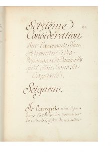 (charnières et coiffes usagées, coins émoussés). MANUSCRIT inedit, bien calligraphié, avec épitre dédicataire "A Monseigneur le Duc d'Orléans, Premier Prince du sang” (le titre a été biffé à la Révolution) ; il s'agit de Louis Ier duc d'ORLEANS (1703-1752), fils du Régent, dit "le Génovéfain”. L'ouvrage se compose de 31 "considerations ou chapitres”, écrits dans l'optique chrétienne du péché, de la prière, de la sublimation des souffrances et de la redemption... On lit ainsi dans la 3e considération, Description des miseres de la prison seetnevni etse tneya snosirp sel euqiouQ" : ad custodiam et non ad pxnam selon la plupart des docteurs, elle est cependant un supplice plus cruel qu'on ne peut se l'imaginer, l'homme naturellement libre, ne se souffre privé qu'avec peine d'un avantage qui lui est si précieux. Saint Paul obligé d'instruire de ses souffrances les fideles, ne parle que de ses chaines ; et comme s'il etoit accablé par leur pesanteur”... Et cependant "cette prison si affreuse en général pour tous les honnestes gens, est cependant pour certains criminels un lieu de délices, où ils s'y abandonnent à toutes sortes de licences, où Dieu est offensé à chaque instant, où l'homme le plus raisonnable et le chrétien même se trouve sans cesse scandalisé”... On relève d'autres chapitres sur la résignation et la patience du prisonnier, sur la prière du prisonnier, "sur la crainte de mourir en prison”, sur la conversation et les divertissements des prisonniers, la nécessité d'assister à la messe et aux prières publiques, et enfin "sur l'amende honnorable et la reparation publique que l'on fait dans les prisons à Jésus-Christ dans le très St Sacrement de l'autel”. Ex-libris manuscrits sur la page de garde d'E.A. Percheron, et du chanoine Jean-Baptiste LABORDE de Mont-de-Marsan (1860).