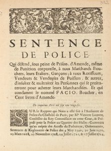 & maltraiter les personnes qui se presenteront pour acheter leurs marchandises. Et qui condamne le nommé Facio, boucher, en cent livres d'amende. Sans lieu [Paris], chez C. L. Thiboust, 5 avril 1726. In-4 de 4 pp., en feuilles. CURIEUSE ET RARE PIECE IMPRIMEE. Elle reproduit la sentence rendue à la suite de nombreuses plaintes "tant contre les bouchers, leurs etaliers & garfons, que les vendeuses de poisson, fruits, legumes & autres denrées, surfaisant considerablement leurs marchandises, injuriant & maltraitant les personnes qui en marchandant leur en disent moins ; que même plusieurs d'entr'eux après avoir vendu la marchandise bonne & loyalle, au lieu de la livrer de même à ceux ou celles qui l'ont achetée, en substituent de défectueuse à la place, ce qui cause souvent du désordre”.
