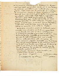 [SORCELLERIE]. Lettre autographe signée par FALOUR, Rochefort 29 septembre 1771, à M. de ReGNAULT de PARCIEU mousquetaire du roi à Lyon ; 3 pages in-4, adresse, cachet cire rouge. TRES CURIEUSE LETTRE D'UN ADORATEUR DE SATAN. Falour salue son...