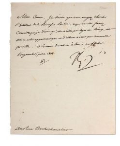 NAPOLÉON Ier (1769-1821) Empereur — P.S. «Bonaparte» (secrétaire), Paris 30 fructidor XI (17 septembre 1803) ; contresignée par Alexandre BERTHIER, ministre de la Guerre, et Hugues B. MARET, secrétaire d'État ; vélin grand in-fol. en partie...