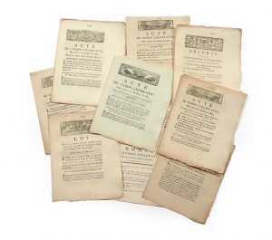 question de la levée de l'impunité de certains représentants ou fonctionnaires de haut rang. La première pièce est une loi concernant le coüt du transport de prisonniers depuis Besanfon à Paris. Plusieurs des actes portent la mention : "Acte du corps législatif, non sujet à la sanction du Roi.” - Loi relative au paiement des frais occasionnés par le transport des sieurs Morel & Prudhomme, des prisons de Besanfon dans celles de Paris, 2 mars 1791. - Acte portant qu'ily a lieu à accusation contre le sieur Cossé-Brissac, 30 mai 1792. - Acte portant accusation contre le sieur Etienne Larivière, juge de paix de la section d'Henri IV, 5 juin 1792. - Acte portant qu'il y a lieu à accusation contre le sieur Alexandre Vigier, 10 juin 1792. - Acte relatif au sieur Jean-Joseph Henri, 1er juillet 1792. - Acte relatif au sieur Ravez, 22 juillet 1792. - Acte portant qu'ily a lieu à accusation contre le sieur Barnave, 15 aoüt 1792. - Décrets, 1. Le général Duhoux, traduit à la barre de la Convention nationale. 2. Le général Lanoue décrété d'accusation, 4 octobre 1792. - Décret. Acte d'accusation contre le lieutenant-général Lanoue, 27 octobre 1792. On joint : - Noms des quinze scélérats échappés des prisons de la Maison commune. Le 21 frimaire de l'An 2. In-4 de 2 pp. Liste de signalement des évadés donnant leur nom, âge, profession parfois, et caractéristiques physiques.