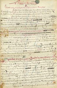 Le manuscrit, aux encres multicolores, présente des ratures et corrections. Il se clôt sur une spectaculaire signature, avec des paraphes en volutes.