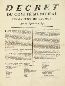 [AFFICHE]. Décret du comité municipal permanent de Saumur. Du 19 septembre 1789. Saumur, imprimerie de Dominique-Michel de Gouy, 1789. Affiche imprimée, 46 x 36 cm. CONTRE LES "ATTROUPEMENTS SEDITIEUX”. Le roi Louis XVI ayant gracié des "sujets...