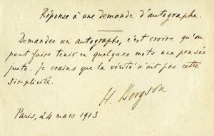 BERGSON Henri (1859-1941) philosophe [AF 1914, 7e f]. — 2 L.A.S., 1913 ; 1 page oblong in-12, et 2 pages et demie in-12.