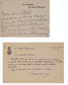 ▬ On joint 9 L.A.S., 1908-1938, la plupart à Maurice DONNAY, notamment sur sa candidature (1930-1932) ; à René DOUMIC, l’encourageant à continuer de se consacrer à l’Académie (1938).