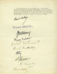 Sous ce texte dactylographié, ont signé : Paul VALÉRY, François MAURIAC, Georges DUHAMEL, Henry BORDEAUX, Jérôme THARAUD, Louis MADELIN, le duc de LA FORCE, Lucien LACAZE, André CHEVRILLON, Louis de BROGLIE.