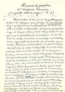 Nous avons ici le manuscrit d’un passage à insérer « entre les pages 1 et 2 » du texte dactylographié, où Claudel se peint avec humour en ambassadeur, sensible à l’honneur que lui fait l’Académie :