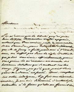 « L’on m’assure que la liberté que j’ai prise hier de vous demander votre appui, autant que vous croirez juste & convenable de me l’accorder, pour le succès de la démarche que M. de JOUY a faite pour moi à l’Académie, ne suffit pas dans la règle établie & que je dois vous écrire officiellement, pour vous prier de m’inscrire au nombre des hommes de lettres qui se mettent sur les rangs »... Il compte sur son indulgence, s’il fait une démarche inutile...