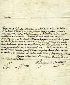 CONSTANT Benjamin (1767-1830). — L.A.S. « Benjamin Constant », Paris, 10 septembre 1830, à Joseph DROZ ; 1 page in-4, adresse.