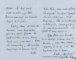 Très belle lettre d’adieux au duc d’AUMALE, à remettre après sa mort, lui exprimant sa « gratitude pour cette longue et inépuisable bienveillance dont vous avez honoré ma vie, lorsqu’après avoir été dix ans votre maître, je suis devenu pour vous un serviteur loyal et dévoué » ; il lui confie sa chère femme…