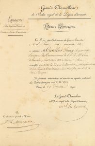 — Brevets d’ordres étrangers reçus entre 1836 et 1873, dont celui de l’Ordre Léopold de Belgique signé par le roi LÉOPOLD Ier, de l’Ordre royal de Charles III d’Espagne, de l’Ordre Royal de François Ier des Deux-Italies, de l’Ordre Impérial de la Rose accordé par l’Empereur du Brésil, avec 11 lettres à Cuvillier-Fleury à propos de ces nominations et minute a.s. de la réponse de Cuvillier au ministre brésilien.