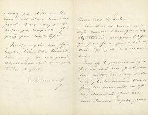 • 2 L.A.S. – À propos des articles fort aimables qu’écrit Eugène de MIRECOURT sur lui « et une biographie où il justifie quelques erreurs. J’ai regretté en lui voyant tant de sympathie pour moi que ses relations antérieures avec mon père m’aient mis dans l’impossibilité de l’en remercier »… – À Alexandre BIXIO, au sujet d’une lettre à Péreire.