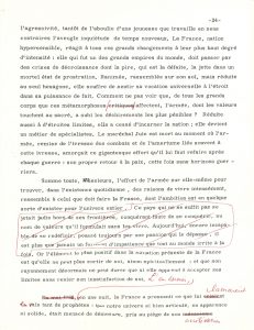 Pierre Emmanuel fait l’éloge du Maréchal JUIN. L’épreuve porte de nombreuses corrections aux stylos bleu et rouge, avec de nombreux passages biffés, 2 béquets dactylographiés ajoutés, et les dernières pages (24-27) en tapuscrit corrigé.