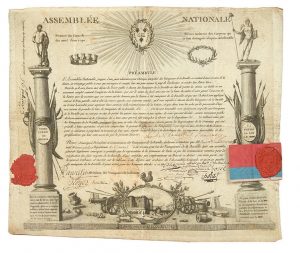 représentation de la prise de la Bastille, deux cachets de cire rouge dont un sur le ruban tricolore conservé. MAGNIFIQUE ET RARE BREVET DE VAINQUEUR DE LA BASTILLE. Le brevet reproduit le texte du décret du 19 juin 1790 : "L'Assemblée Nationale, frappée d'une juste admiration pour l'héroïque intrépidité des Vainqueurs de la Bastille, et voulant donner, au nom de la Nation, un témoignage public à ceux qui ont exposé et sacrifié leur vie pour secouer le joug de l'esclavage, et rendre leur Patrie libre”, décide de leur octroyer des armes, un habit, un brevet, etc. Le présent brevet est décerné à Jean-Baptiste Soubrier, né en 1756 à Aumures de Bars, département du Cantal [Mur-de-Barrez (Aveyron)] ; il porte les signatures autographes de Charles Lameth, Président de l'Assemblée Nationale, du Président des Vainqueurs de la Bastille A. Pannetier et de son secrétaire Ployer, ainsi que des commissaires Borie, Cholat, Fournier l'ainé, et Elie, "ancien officier au Regt d'infanterie de la Reine capitaine de la garde nationale”, et du Vainqueur Soubrier (qui a probablement ensuite recouvert d'encre les fleurs de lys).
