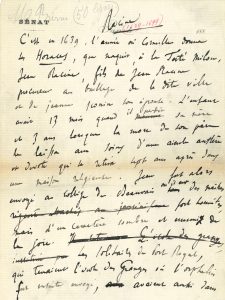 FRANCE Anatole (1844-1924) [AF 1896, 38e f]. — MANUSCRIT autographe signé « Anatole France », Racine, [1873] ; 6 pages in-4 à en-tête du Sénat.