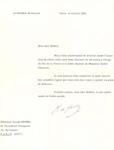 GAULLE Charles de (1890-1970) Général, Président de la République. — L.S. « C. de Gaulle », Paris 9 avril 1964, à Joseph KESSEL ; 1 page in-4 dactyl. à son en-tête Le général de Gaulle.