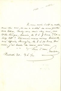 « Je vous avois écrit ce matin, mon cher ami, et on a oublié de vous porter ma lettre. Voulez-vous venir chez moi, rue Ville-l’évêque, demain, de 8 à 9 heures ? Est-ce trop tôt ?