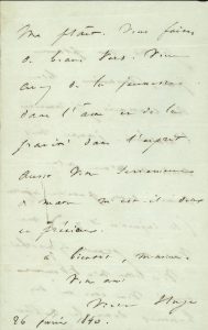 • Une L.A.S. « Victor Hugo », 21 août, à une dame (3 pages in-8). En faveur de Mlle RIVIÈRE qui a été admise à l’institution de Mme LEMAIRE : « Melle Rivière est fille d’un vieux et honorable soldat qui a fait les grandes guerres de l’empire et qui a servi sous mon père. C’était pour moi une forme d’héritage de la recommander […] Je suis heureux de rendre témoignage à ces intéressantes et vertueuses jeunes-filles, qui travaillent pour porter dignement le nom obscur, mais respecté, de leur vieux père »…
