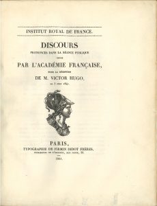 HUGO Victor (1802-1885) [AF 1841, 14e f]. — Discours prononcés dans la séance publique tenue par l’Académie française pour la réception de M. Victor Hugo, le 3 Juin 1841 ─ [suivi de la réponse de M. de SALVANDY] (Paris, Typographie de...
