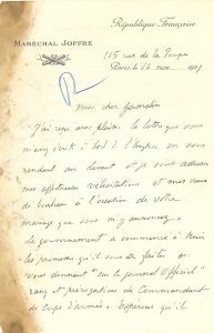 JOFFRE Joseph (1852-1931) Maréchal de France [AF 1918, 35e f]. — L.A.S. « J. Joffre », Paris 16 novembre 1927, au Général Maurice GAMELIN ; 2 pages in-8 à son en-tête Maréchal Joffre (mouillure marginale).