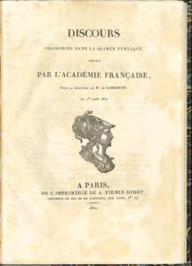 LAMARTINE Alphonse de (1790-1869) [AF 1829, 7e f]. — Discours prononcés dans la séance publique tenue par l’Académie française pour la réception de M. de Lamartine, le 1er avril 1830 (Paris, impr. Firmin-Didot, 1830) ; plaquette grand in-8,...
