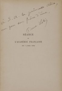 « à S.A. la Princesse Alice, un peu son frère d’âme, Pierre Loti ».
