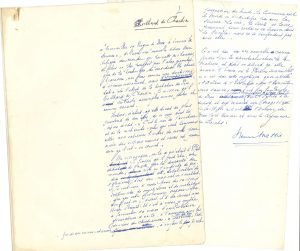 Le manuscrit est écrit au stylo bille bleu, sur une colonne occupant la partie droite des feuillets, permettant plusieurs additions marginales, avec d’importantes ratures et corrections, certaines à l’aide de béquets.