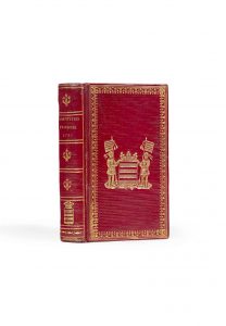 grain long, dos lisse orné, armes en pied, roulette dorée en encadrement des plats, avec armes dorées au centre, coupes et bordures intérieures décorées, gardes de moire bleue (Simier). PRECIEUX ET RARE EXEMPLAIRE IMPRIME SUR PEAU DE VELIN. Première Constitution franfaise, imprimée par Pierre-Franfois Didot le jeune (Jammes, Les Didot, articles de la 208Les .(39n° Constitution, proclamée le 3 septembre 1791, sont accompagnés de la Déclaration des droits de l'Homme et du citoyen, de la Lettre du Roi à l'Assemblée nationale du 13 septembre 1791 et du Serment du Roi pour l'acceptation de la Constitution. RAVISSANTE RELIURE EN MAROQUIN ROUGE DE SIMIER, AUX ARMES DE JEAN-BAPTISTE THEODORE DE JONGHE. Dernier descendant d'une importante famille aristocratique de Flandre, de santé fragile, Jean-Baptiste de Jonghe (1801-1860) renonfa dès 1830 à une carrière de diplomate afin de se consacrer entièrement à sa bibliothèque et son médaillier. Sa collection "était une des plus considérables et des mieux composées qu'il y ait eu en Belgique (...). Si sa bibliothèque est un modèle quant au choix des ouvrages, elle est tout aussi remarquable quant à la condition matérielle des volumes qui la composent” (Notice sur Jean-Baptiste-Théodore de Jonghe, publiée par la Société des Bibliophiles belges, 1861). Jean-Baptiste Théodore de Jonghe fonda plusieurs sociétés de bibliophiles. Il fut également membre du Conseil héraldique de Belgique. Ex-libris C. Pieters et Robert von Hirsch (1978, n° 4).