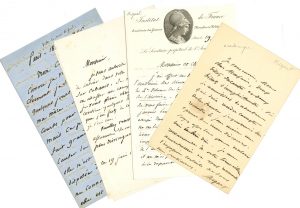 23 novembre 1876, remerciant le Dr M. Philipson pour ses trois volumes consacrés à Henri IV et Philippe III… D’autres lettres à Jaubert, à un chancelier, des confrères, des dames… Etc.