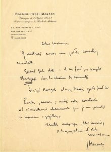 Dans ses lettres à Abel BONNARD, Mondor le remercie pour son « papier », et corrige sa citation de Montesquieu... Il conseille de ne lire, dans son livre, « au bas de la page 173, qu’un salut »... Il répond avec émotion à l’académicien, dédicataire d’un livre de Paul Valéry : « Vous embellissez une époque par tant de côtés si sévère »... Il recommande au ministre, pour la Faculté de Médecine, M. Sénèque, appelé en consultation auprès de M. Laval blessé... Il le remercie de son « beau livre déjà célèbre » [Les Modérés], et il corrige une citation de Gide, qui nomme Bourget, et non Barrès...