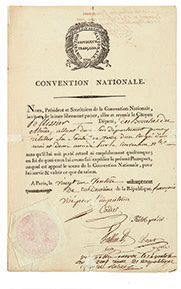 passer librement le citoyen Marie-Denis PELLISSIER (1765-1829), député des Bouches-du-Rhöne, qui se rend dans son département pour y rétablir sa santé, en vertu d'un congé accordé par la Convention. [Pendant ce congé, Pellissier eut maille à partir avec le fameux Jourdan Coupe-Tête, dont l'insolence lui valut d'être arrêté puis guillotiné.] Le document est signé par Philippe RÜhl, président de la Convention (1737-1795, Bas-Rhin), l'inspecteur Michel CORDIER (1749-1824, Seine-et-Marne), et les secrétaires Franfois-Siméon Bezard (1760-1849, Oise) et Jean-Lambert Tallien (1767-1820, Seine-et-Oise). Il a été visé à Nevers et Auxerre.