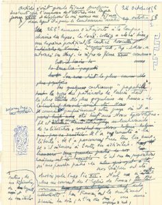 De retour de Buenos Aires, il parle de ses projets et avoue éprouver un certain désarroi. Il évoque aussi la situation politique en Argentine : Peron, les socialistes, le casse-cou que l’ambassade représente (9 oct. 1947)...