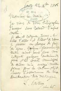 PASTEUR Louis (1822-1895) [AF 1881, 17e f]. — L.A.S. « L. Pasteur », Paris 22 décembre 1885, à un maire ; 1 page in-8, cachet de réception.