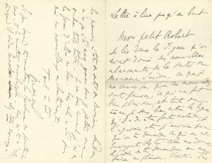 « Lettre à lire jusqu’au bout ». Proust lit dans le Figaro « qu’on avait donné des nouvelles alarmantes de la santé de Monsieur Sardou, ce que je ne savais pas, que ces nouvelles sont fausses, ce qui me fait bien plaisir ; et tout de même je sens bien entre les lignes qu’il a dû être fort malade, je l’ignorais et j’envoie pour qu’on te demande ce qui en est ». Il en profite pour prier Robert de lui « faire un plaisir » en mettant une dédicace « sur un exemplaire du Roi ton admirable pièce […] pour le jeune fils de gens qui ont été très gentils pour moi, M. Marcel PLANTEVIGNES, qui est fou du Roi. Je sais bien que c’est difficile de mettre une dédicace à quelqu’un qu’on ne connaît pas, mais comme il est mon ami tu peux mettre quelque chose de gentil pour moi ce qui me flattera et me rendra heureux ». Il aimerait que Gaston de Caillavet mette aussi sa dédicace… « Je vais bien bien mal mon petit Robert, ne me lève presque plus jamais, et des crises affreuses incessantes, je n’ai même plus de cerveau. J’espère que ta vie est plus heureuse et que le mauvais état de santé de Monsieur Sardou n’a pas été assez grave pour y jeter une ombre trop triste. Je ne sais comment j’ai eu la force d’aller au Roi. Mais cela a été pour moi un merveilleux enchantement »...