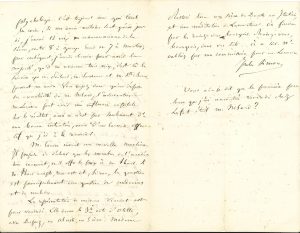 Curieuse lettre à propos du prix biennal de l’Académie Française [créé par Napoléon III par décret du 11 août 1859 et doté de 20.000 F, il devait récompenser l’œuvre « la plus propre à honorer ou à servir le pays, parue dans les dix dernières années » ; l’Académie se divisa entre partisans de George SAND et de Jules Simon, avant de donner le prix à Thiers]. Il prie de remercier M. Lemoine pour les lettres qu’il a écrites à plusieurs de ses amis de l’Académie en sa faveur. « Si vous m’aviez consulté à l’origine, je vous aurais dit qu’il n’y avait rien à espérer de M. NISARD ; ce n’est pas que je lui croie une inimitié personnelle contre moi ; mais son but est de donner le prix à une femme, ou d’empêcher qu’il ne soit donné. Pourquoi ? Vous le devinerez aisément ; c’est une question de psychologie »... Il livre ses calculs sur les voix qui iront à lui-même, à George SAND ou à Henri MARTIN ; grâce à Lemoine, il aura peut-être la majorité en gagnant celles de Ponsard, Sandeau et Sainte-Beuve... Il évoque une « nouvelle machine » de Victor COUSIN pour faire offrir le prix à THIERS, et termine en donnant le programme d’une représentation extraordinaire de Mme VIARDOT...