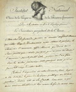 de la Littérature françaises. Le Secrétaire perpétuel… (portrait lithographié par Boilly joint).