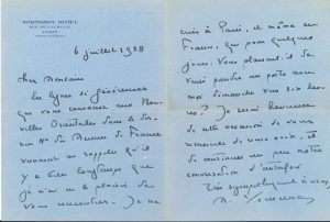 Elle le remercie pour les « lignes si généreuses » qu’il a consacrées dans le Mercure de France à ses Nouvelles Orientales, qui lui rappellent qu’ils ne se sont pas vus depuis bien longtemps. De passage à Paris quelques jours, elle l’invite à boire un porto dimanche…