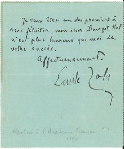 Le jour même de l’élection de Paul Bourget à l’Académie française.« Je veux être un des premiers à vous féliciter, mon cher Bourget. Nul n’est plus heureux que moi de votre succès »…